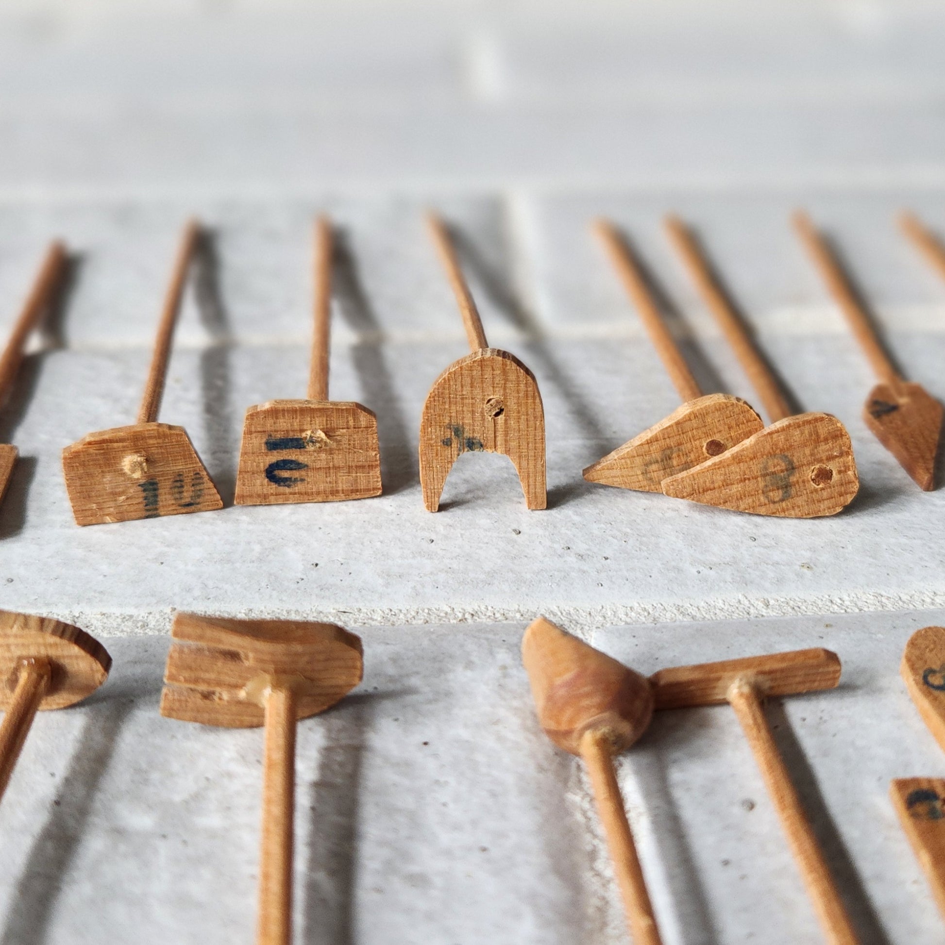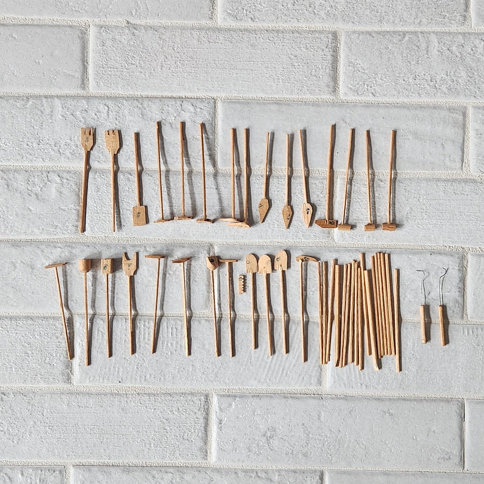 🎲 The "Straws" are in fantastic shape! They appear to be hand carved. One rake is broken, but it looks like it could be glued back on. There is no indication as to how many sticks should be included. I did find it mentioned on the web, that there should be 57 sticks. This game has 17 straight pieces and 27 tools plus 2 hooks.
