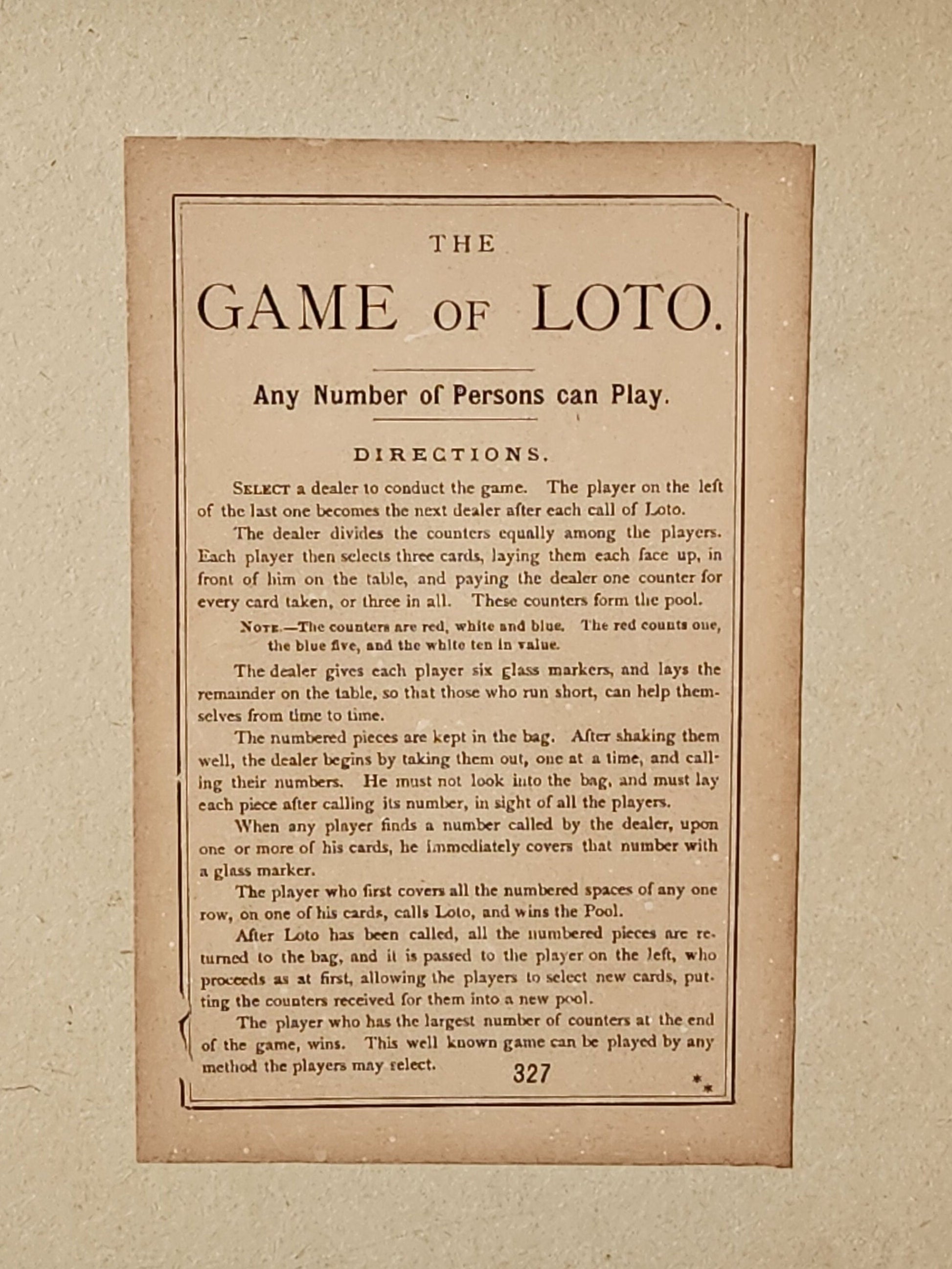 This 1895 McLoughlin Brothers Lotto (No. 327) game is in fantastic condition! From the McLoughlin Brothers 1895 catalog for the #327 game offered: