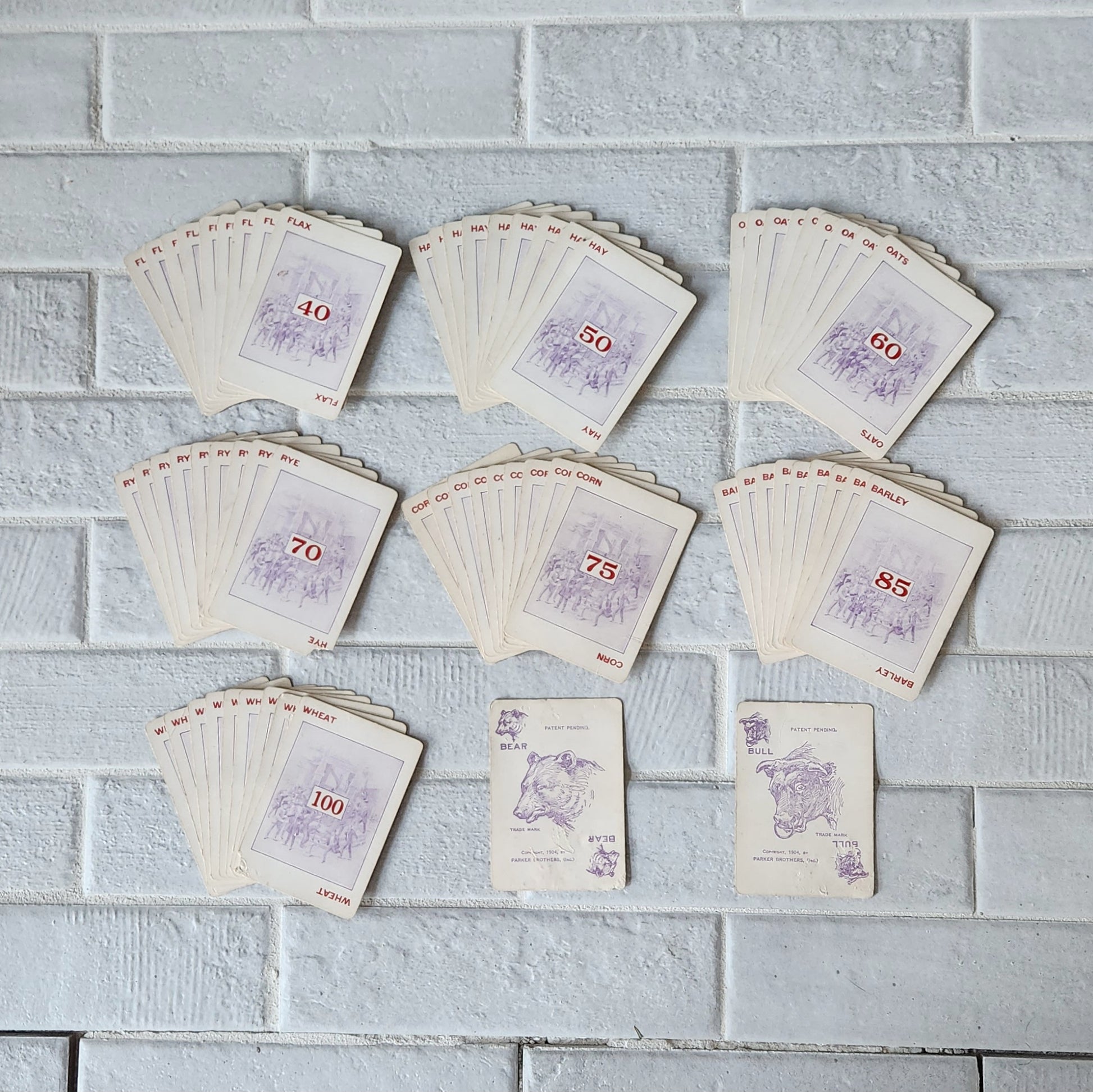 🎲 All cards are present (7 commodities with 9 cards each) and include the Bear and Bull card. The cards do show wear, with some missing corners, in line with their age. The Bull and Bear cards show additional wear. Please see pictures.