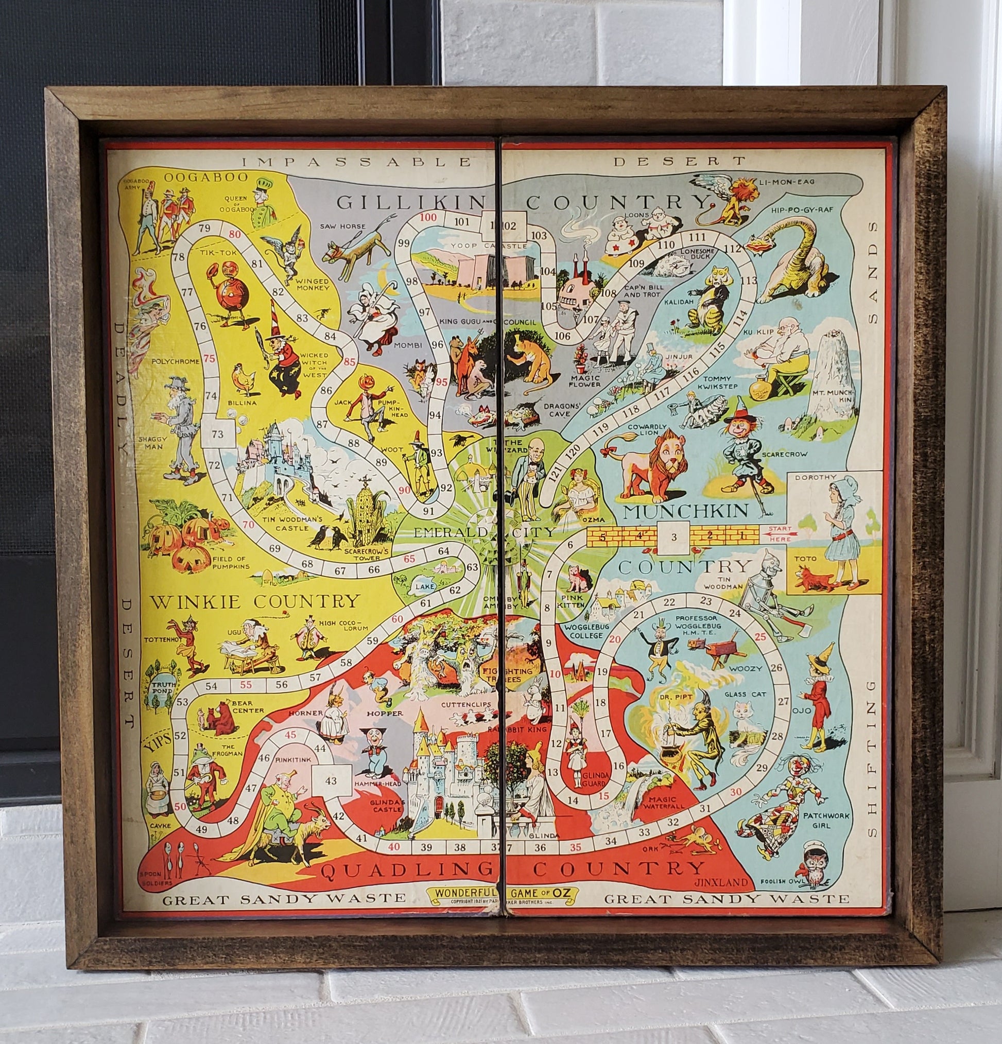Parker Brothers used the graphics from L. Frank Baum's map of Oz to create this gorgeous game in 1921. The rules were copyrighted in 1922. Tracing the date of the different versions is difficult as the copyrights were not updated, due to the lack of changes to the game board or the rules. This game was distributed in a long box with a stunning lithographic label of Dorothy, the Tin Man, Scarecrow, and the Lion. It was also distributed as a set: the board with a small utensil box. If you're lucky, you might find a version with the pewter tokens, but those sets go for well over $1,200!