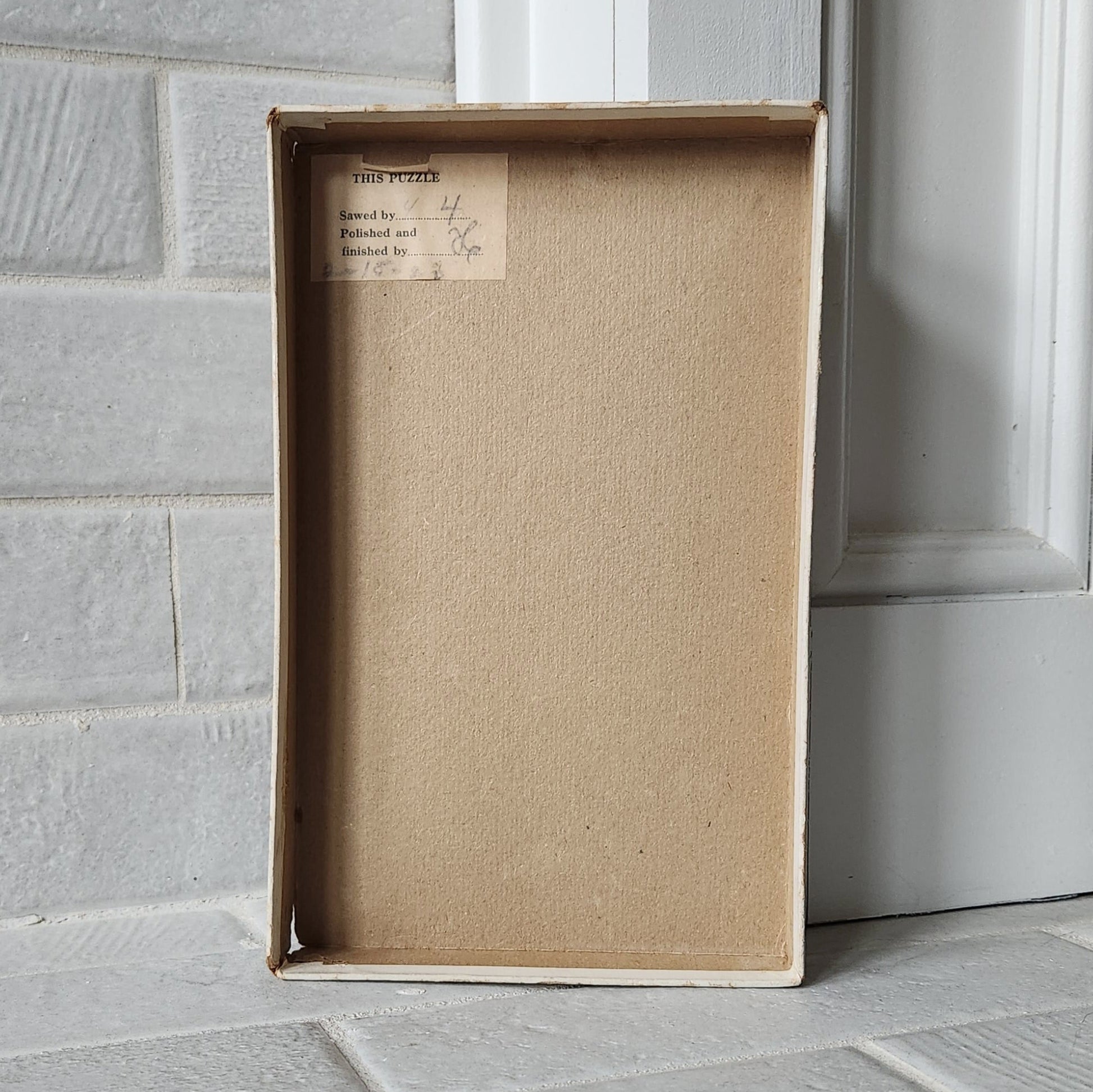 - The box is sturdy and in tact , but has wear on the edges with some separation. The owner wrote their initials on the lid, the box label and a slight remnant of their full signature is on the bottom of the box. There is a photograph of the finished puzzle and an old note about the 1 piece missing.