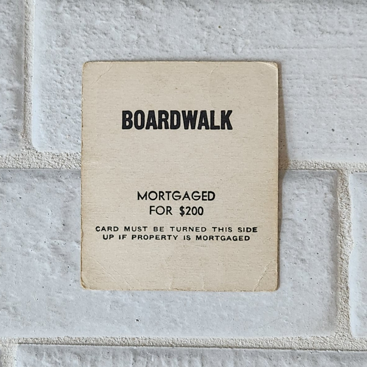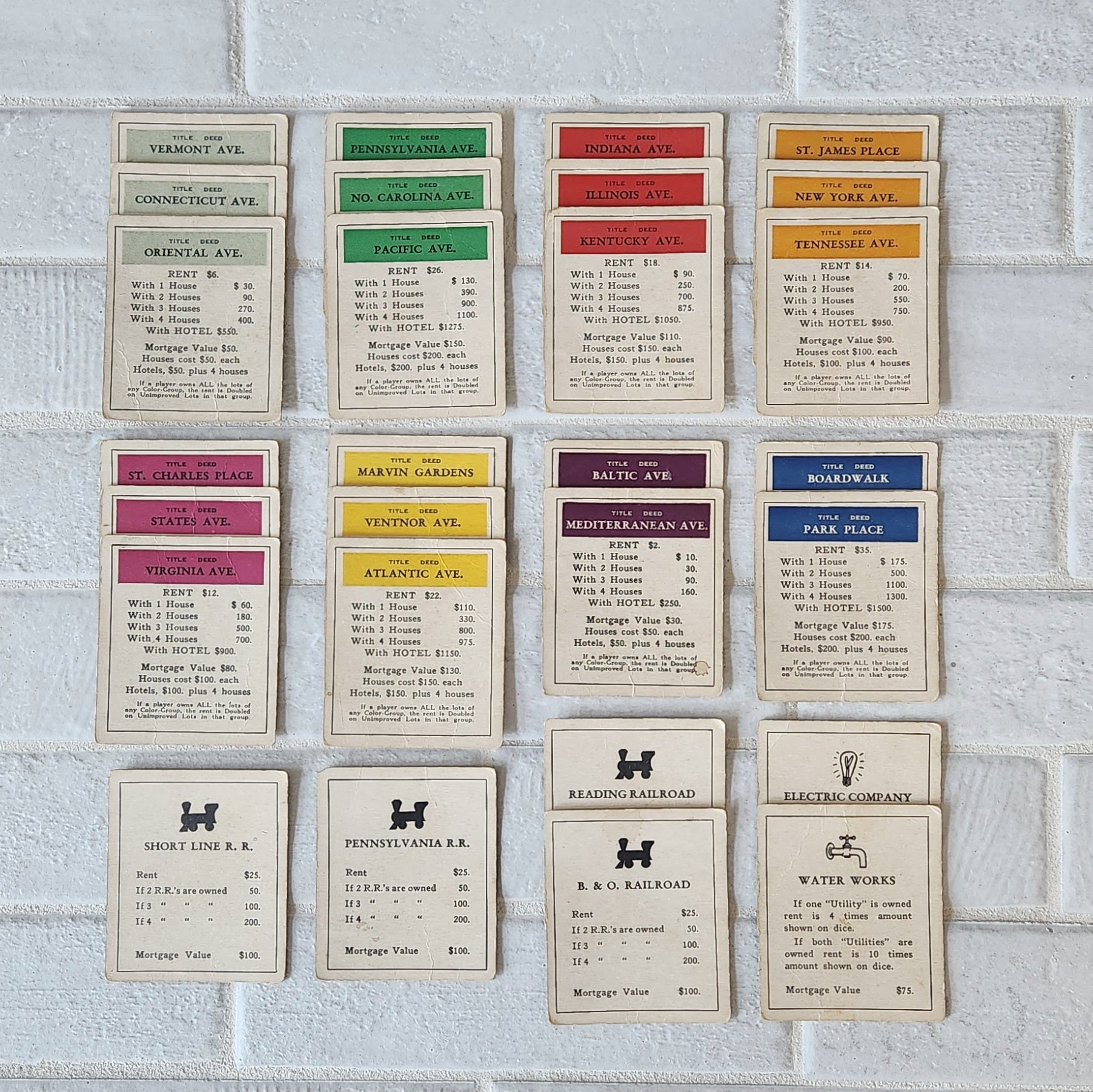 All utensils are present. This version has 7 wooden playing pieces and wooden dice. The money are the small bills and are worn, especially the 1's. The property cards are in pretty good shape, but are stained with age.