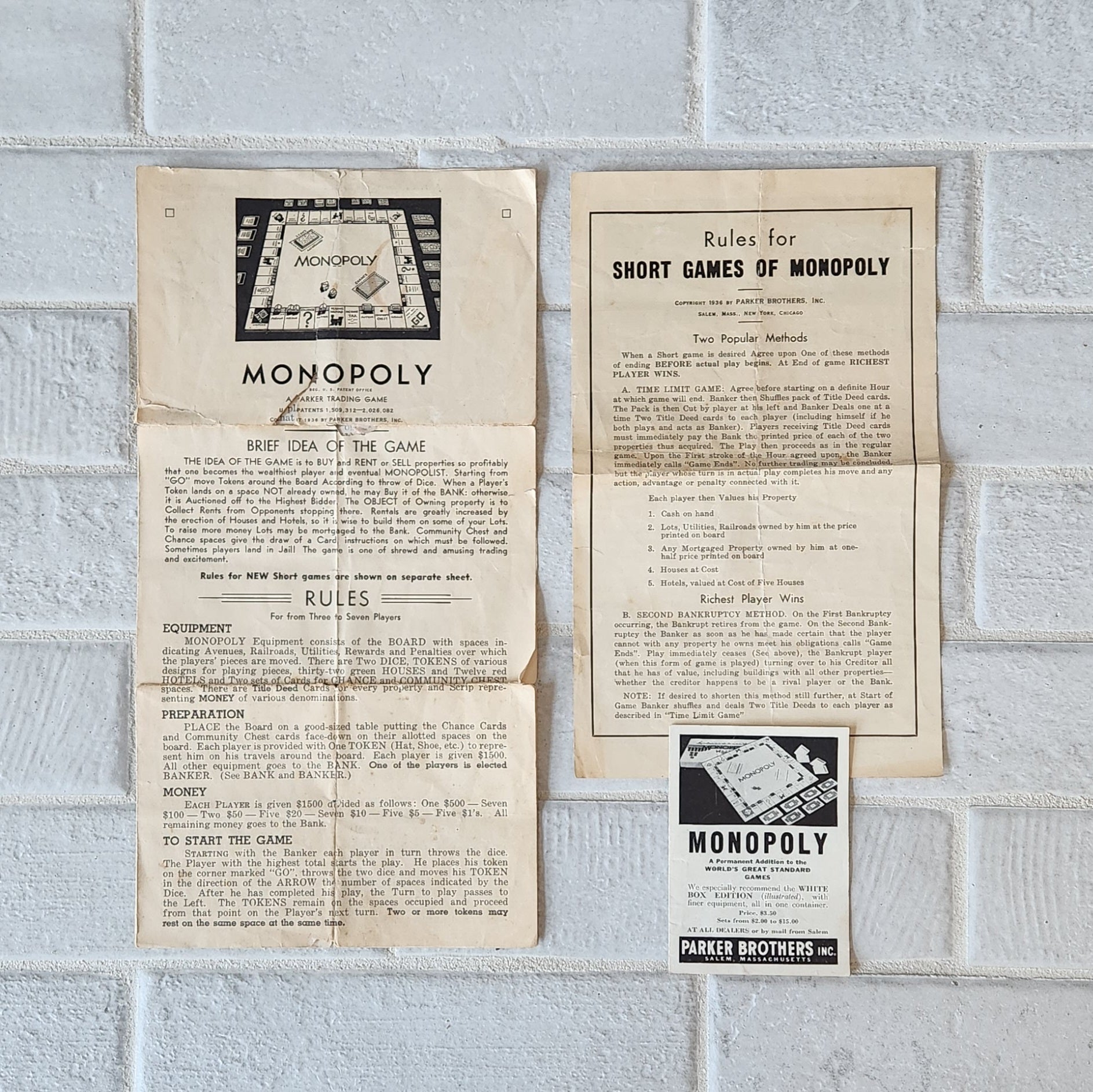 - The instructions and "short game" rules are present and very worn. There is a Parker Brothers ad insert included.