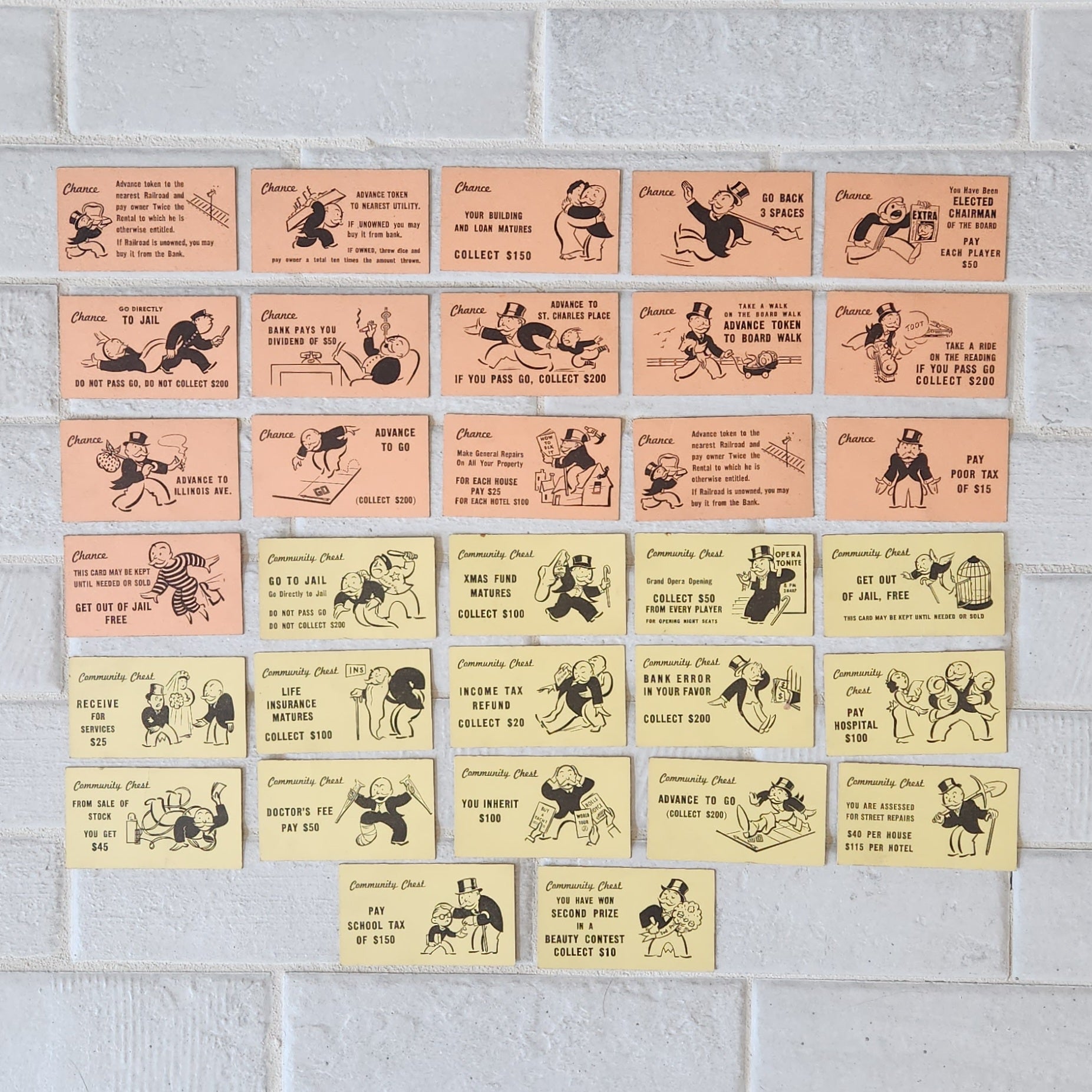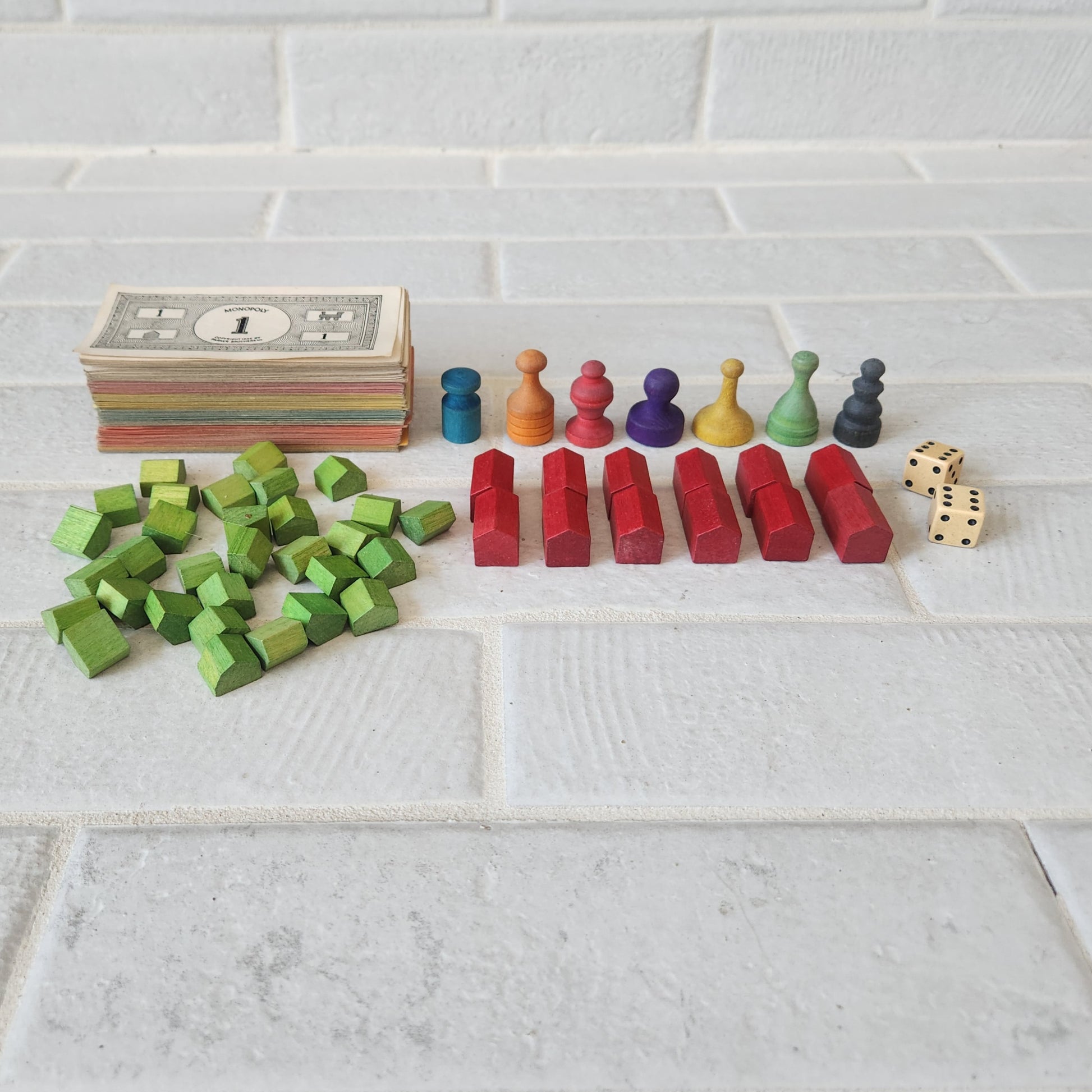 All utensils are in great condition. The money is the small bills with the salmon-colored 100s. This version has 7 wooden playing pieces. All Chance and Community Chest cards are present as well as all of the property cards. All cards are in great condition.