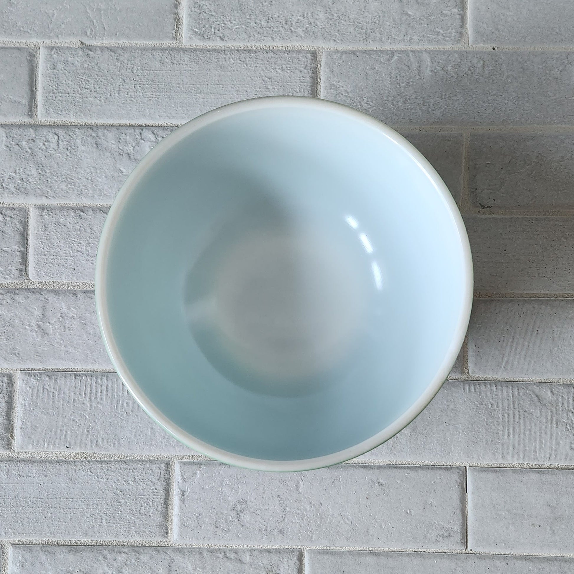 The 1945 Primary Colors Bowl Set was the first of the opal ware with an overlay of color produced by Pyrex. It was the result of a collaboration between Corning Glass Works and the US Government to create a sturdy, unbreakable dish for WWII soldiers. This version with the deeper foot was redesigned in 1950 with the more familiar, and flatter, bottom. This set did not have the standard model numbers stamped on the bottom.