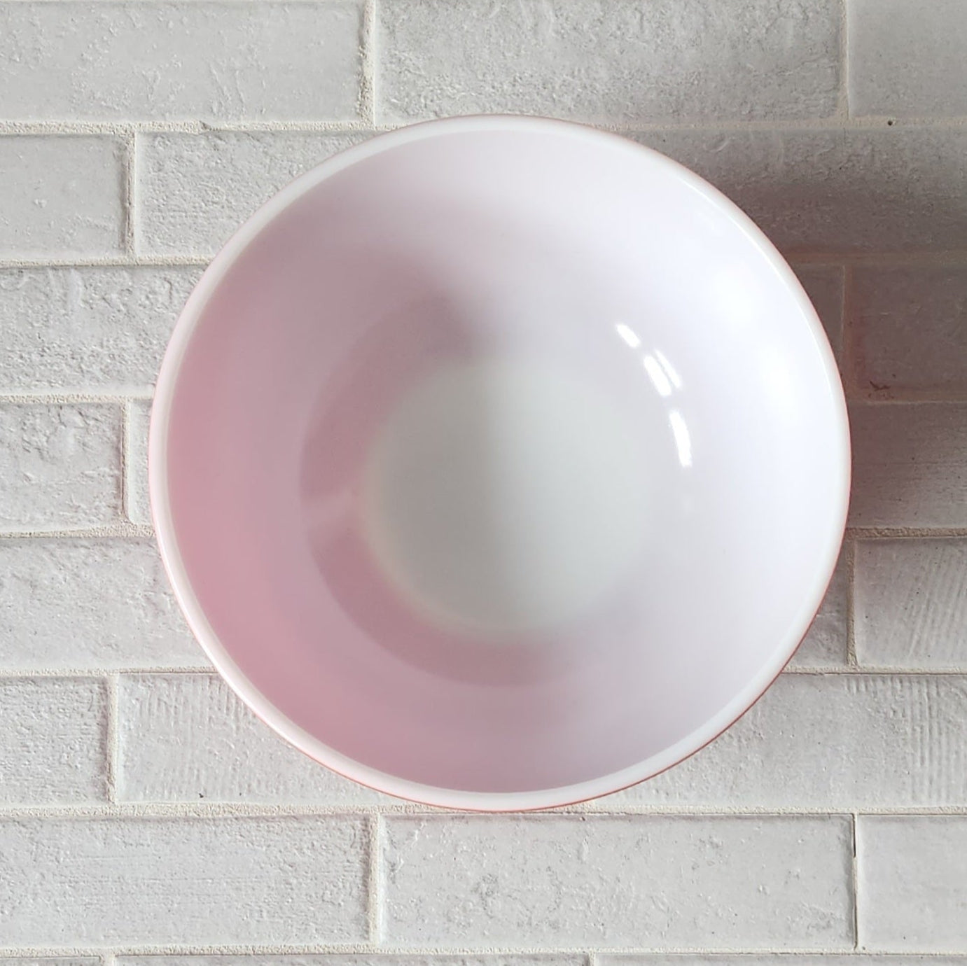 The 1945 Primary Colors Bowl Set was the first of the opal ware with an overlay of color produced by Pyrex. It was the result of a collaboration between Corning Glass Works and the US Government to create a sturdy, unbreakable dish for WWII soldiers. The foot of the bowl from 1945 to 1949 was deeper than the redesigned version in 1950 that has the flatter footing.