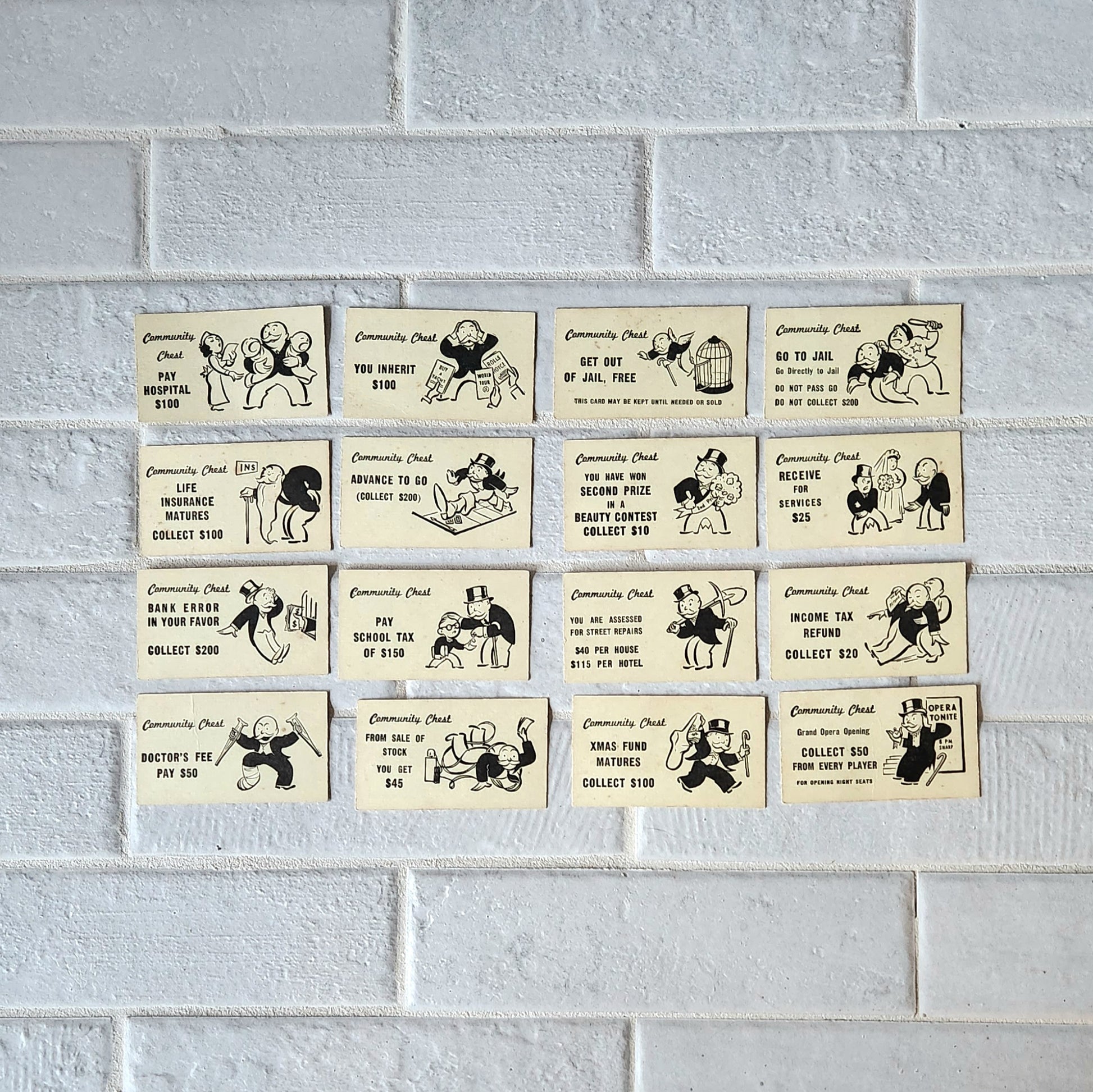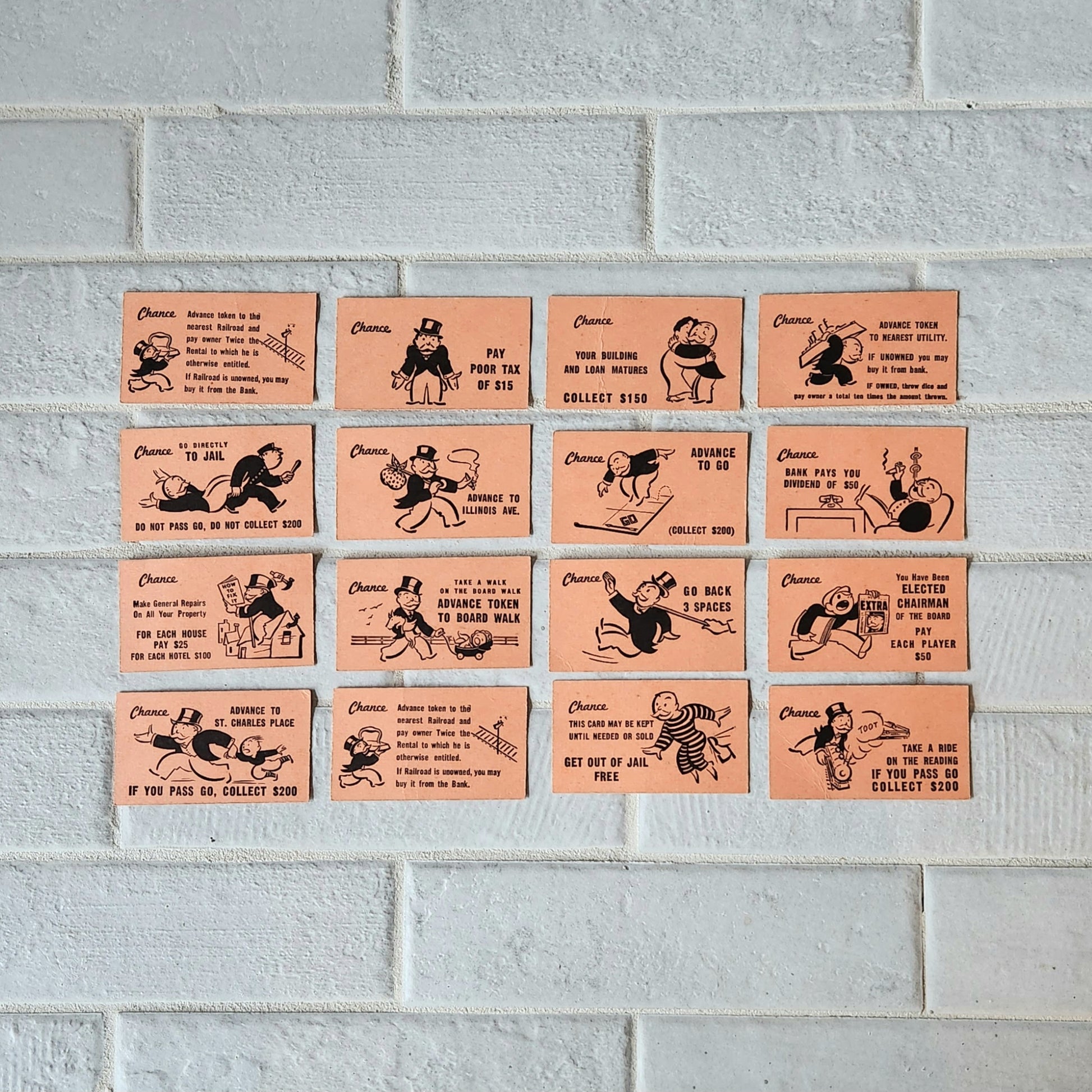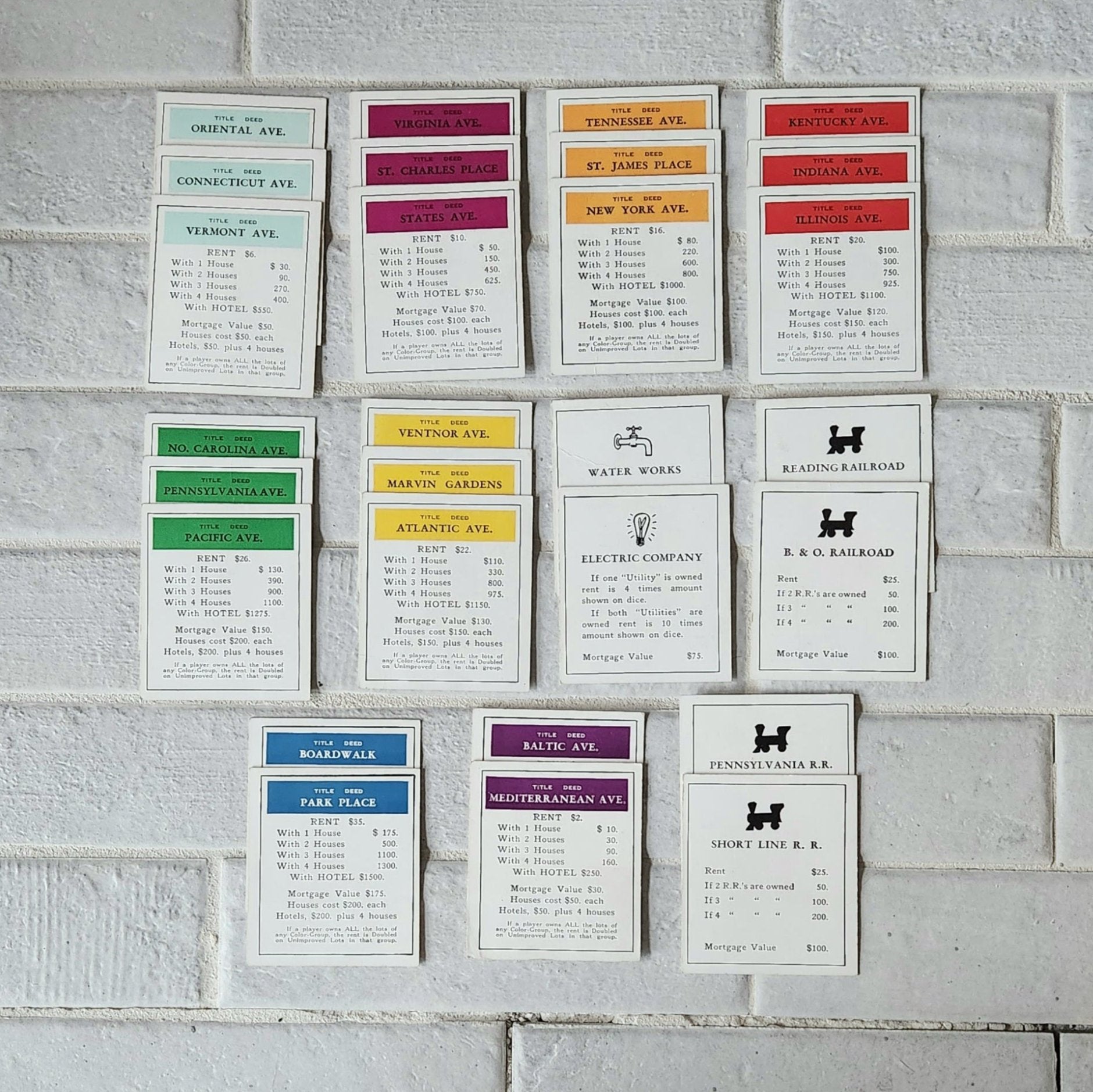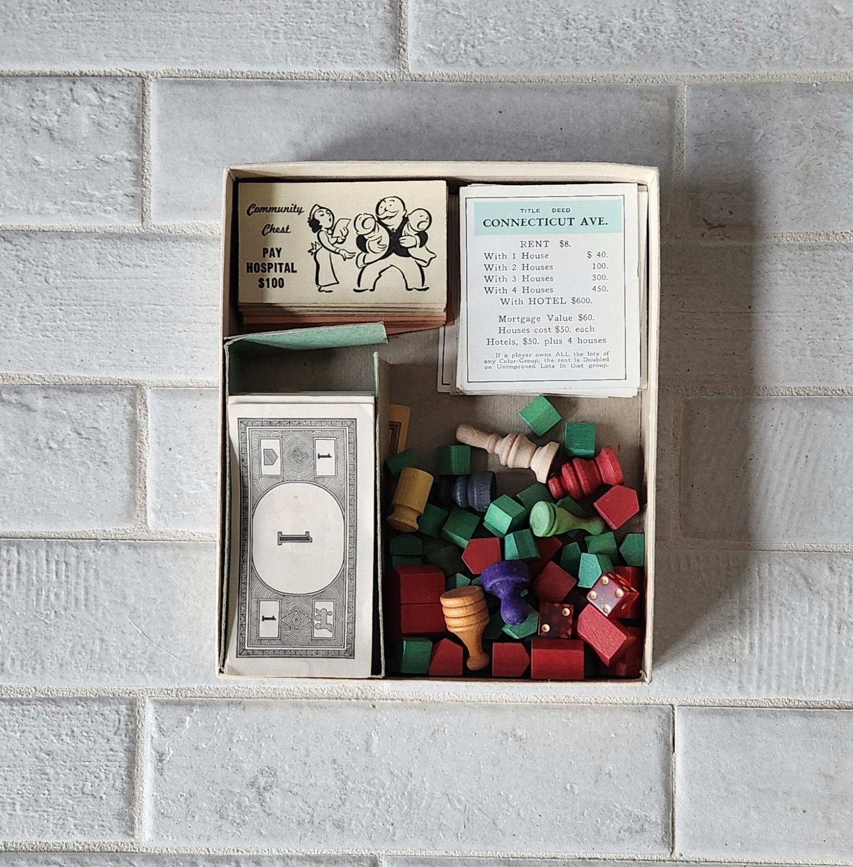 This version has 8 wooden playing pieces, but one is missing. All Chance and Community Chest cards are present as well as all of the property cards. All cards are in great condition.