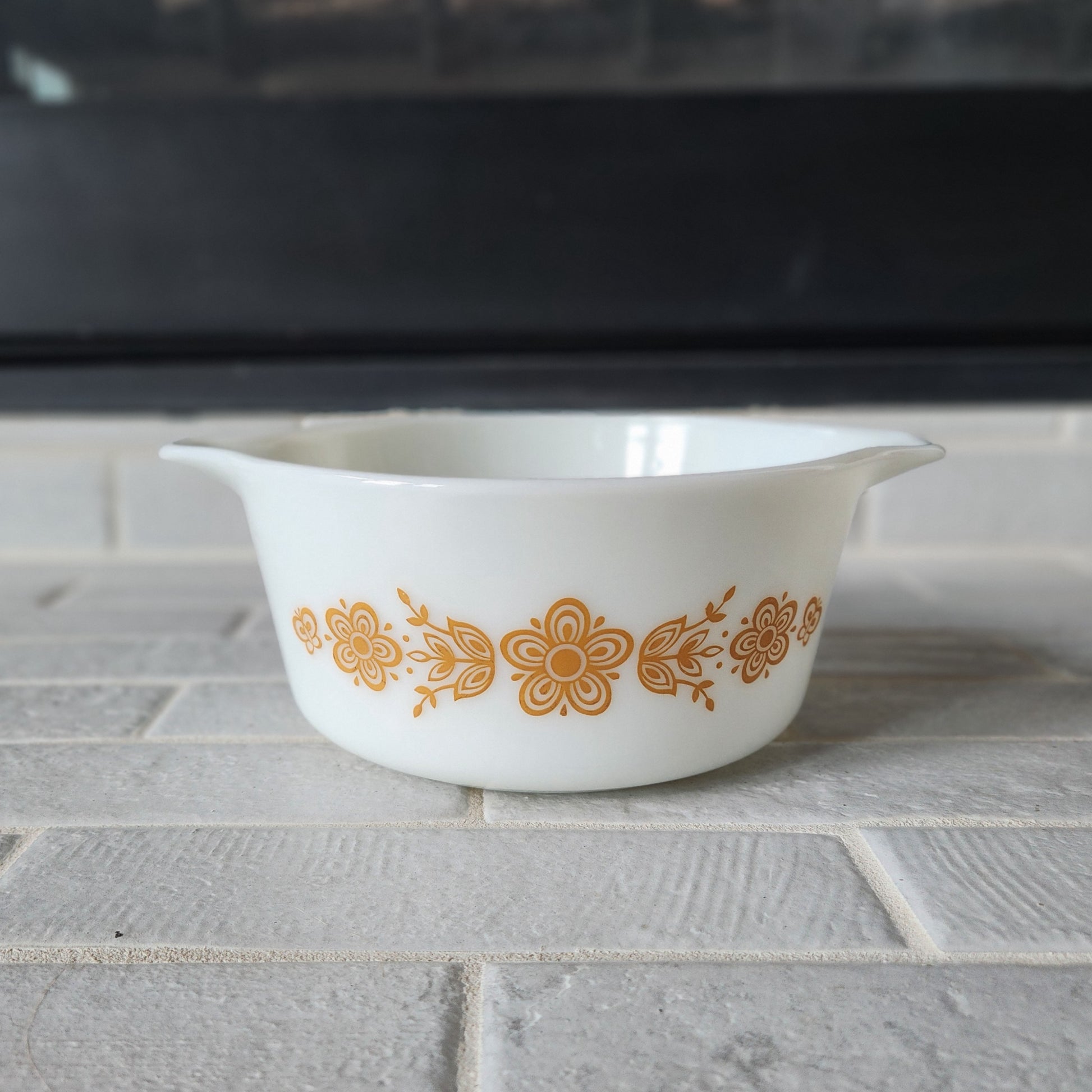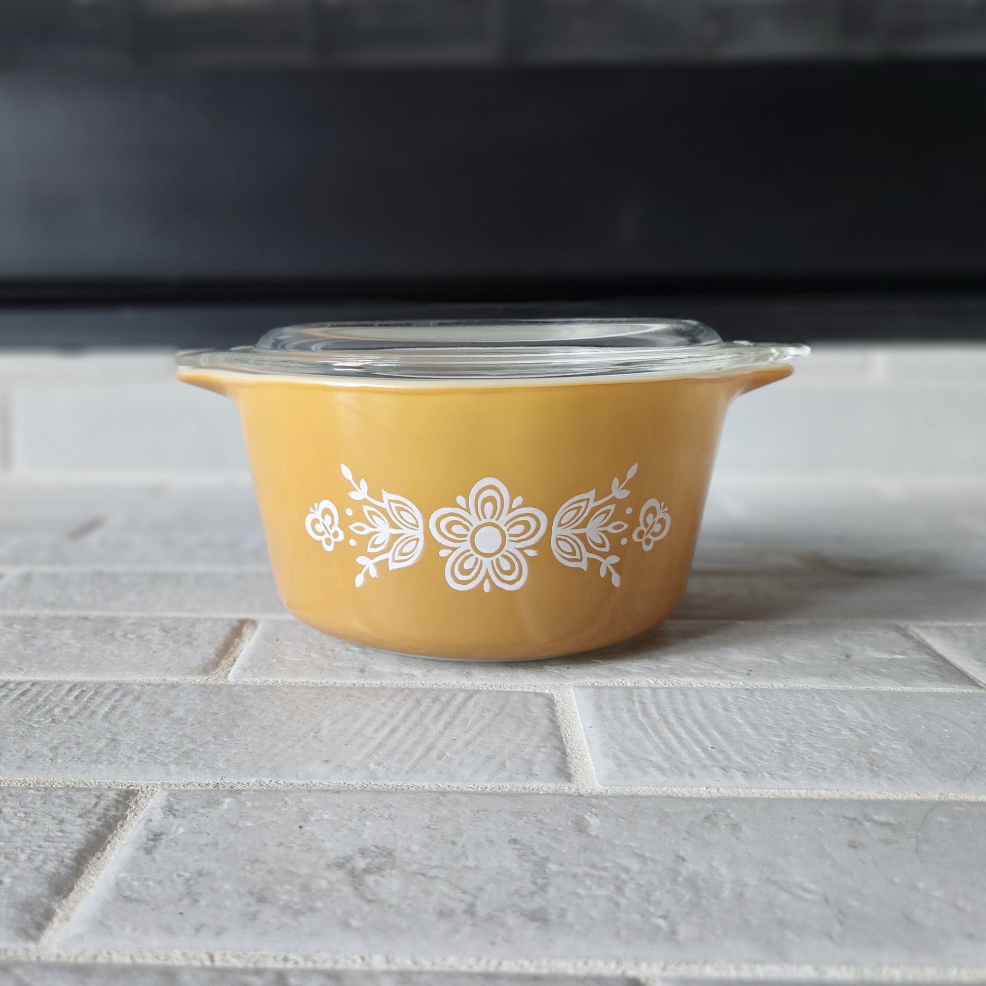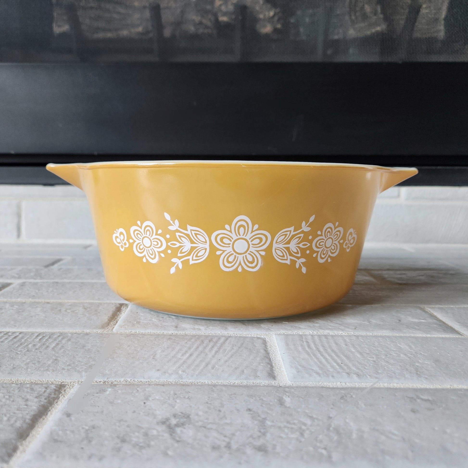 This gorgeous vintage Pyrex casserole 3-piece set features the iconic 1970s gold and white butterfly and floral design that captures the charm of classic mid-century entertaining. Whether you're hosting a dinner party or bringing a dish to share, this set combines functionality with retro style.