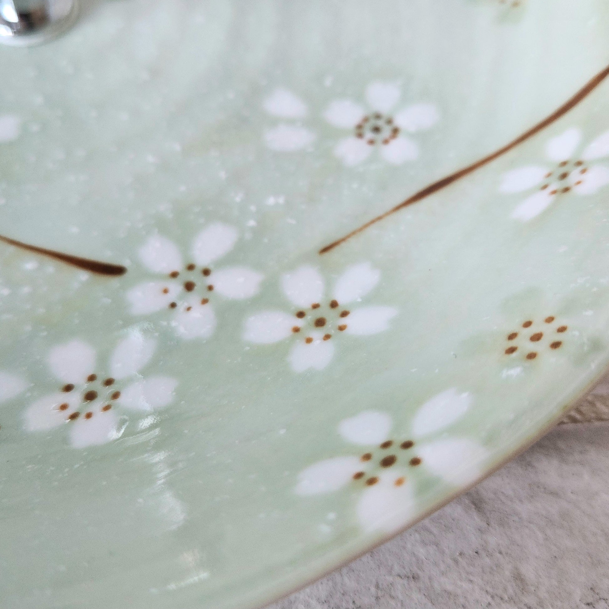 This 2 Tiered Tray is perfect for serving cakes, cookies, veggies, or anything you can dream up! The bottom plate is a pale green with white cherry blossoms and the top plate is white.