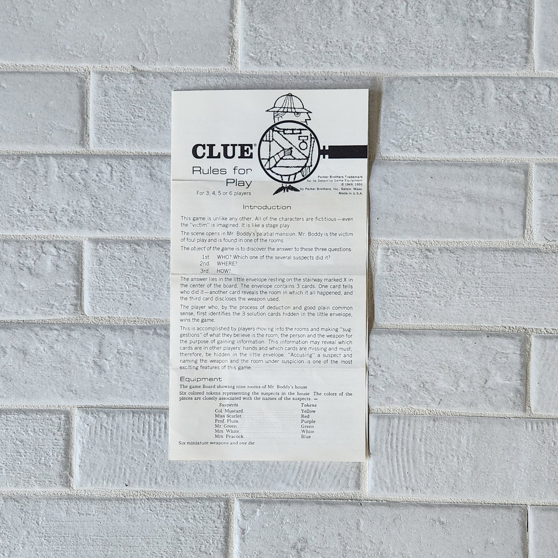 Invented by Anthony Pratt, a British musician, who got the idea while playing piano for guests in European country mansions, while they play-acted murder mystery games in their parlor. His wife, Elva, designed the original game board. This board is the second version by Parker Brothers.