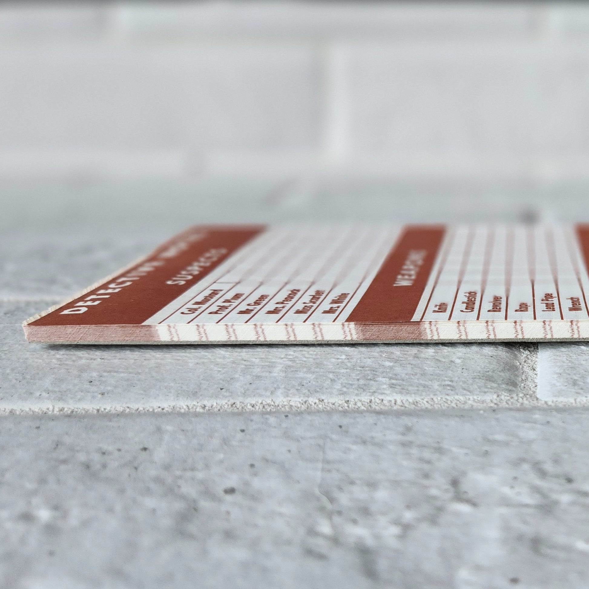 🎲 All pieces are present and in wonderful condition! The pawns are wooden and the weapons are metal with the plastic rope. The Detective Notes appear to only have a few sheets missing, if any. All 4 pencils are present and the cards appear hardly used!