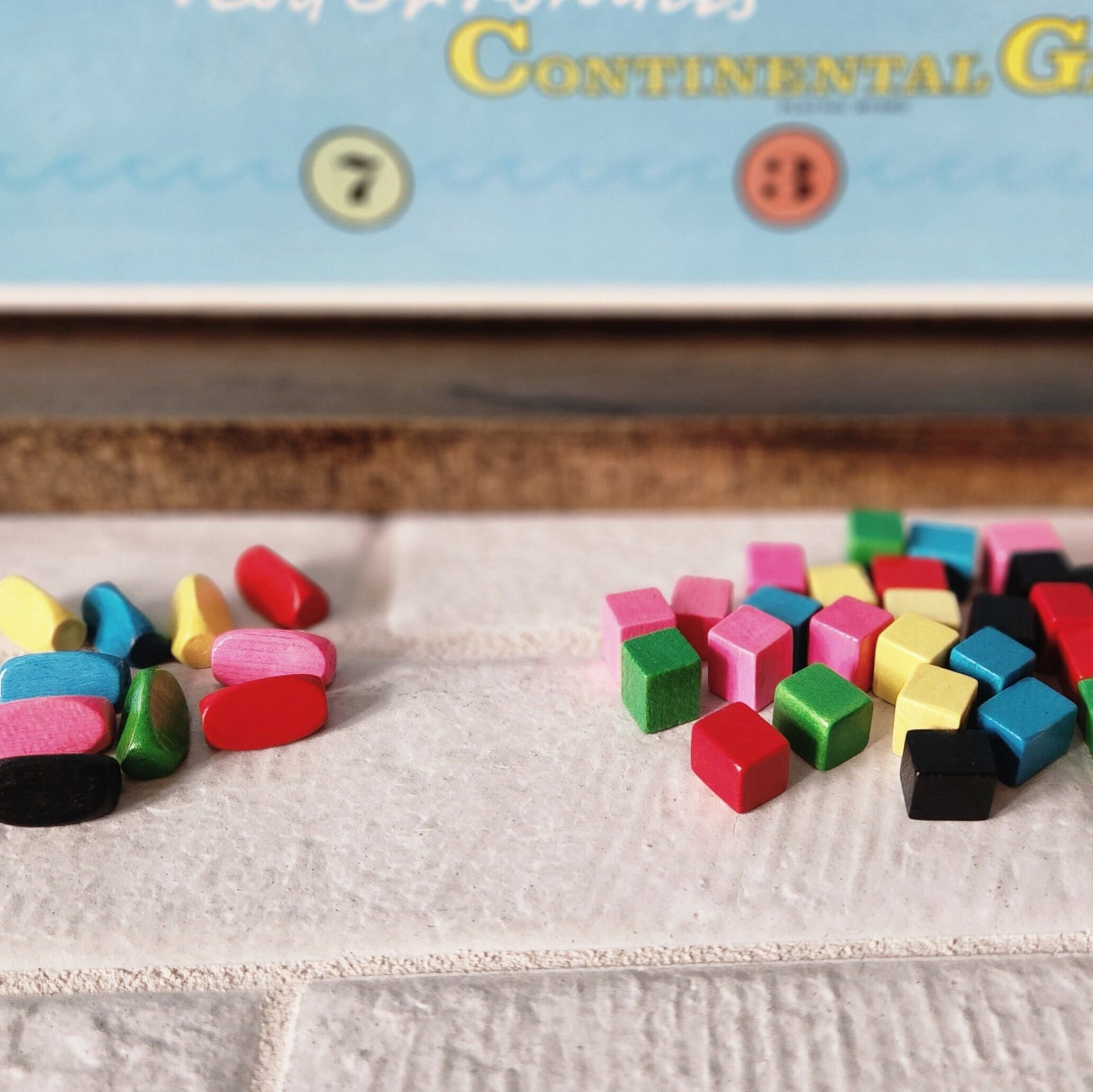 🎲 The playing pieces are made of gorgeous polished wood and in fantastic condition with beautiful colors. While the instructions do not call out a specific number of cube and oblong pieces, it appears that there is one black oblong piece missing.