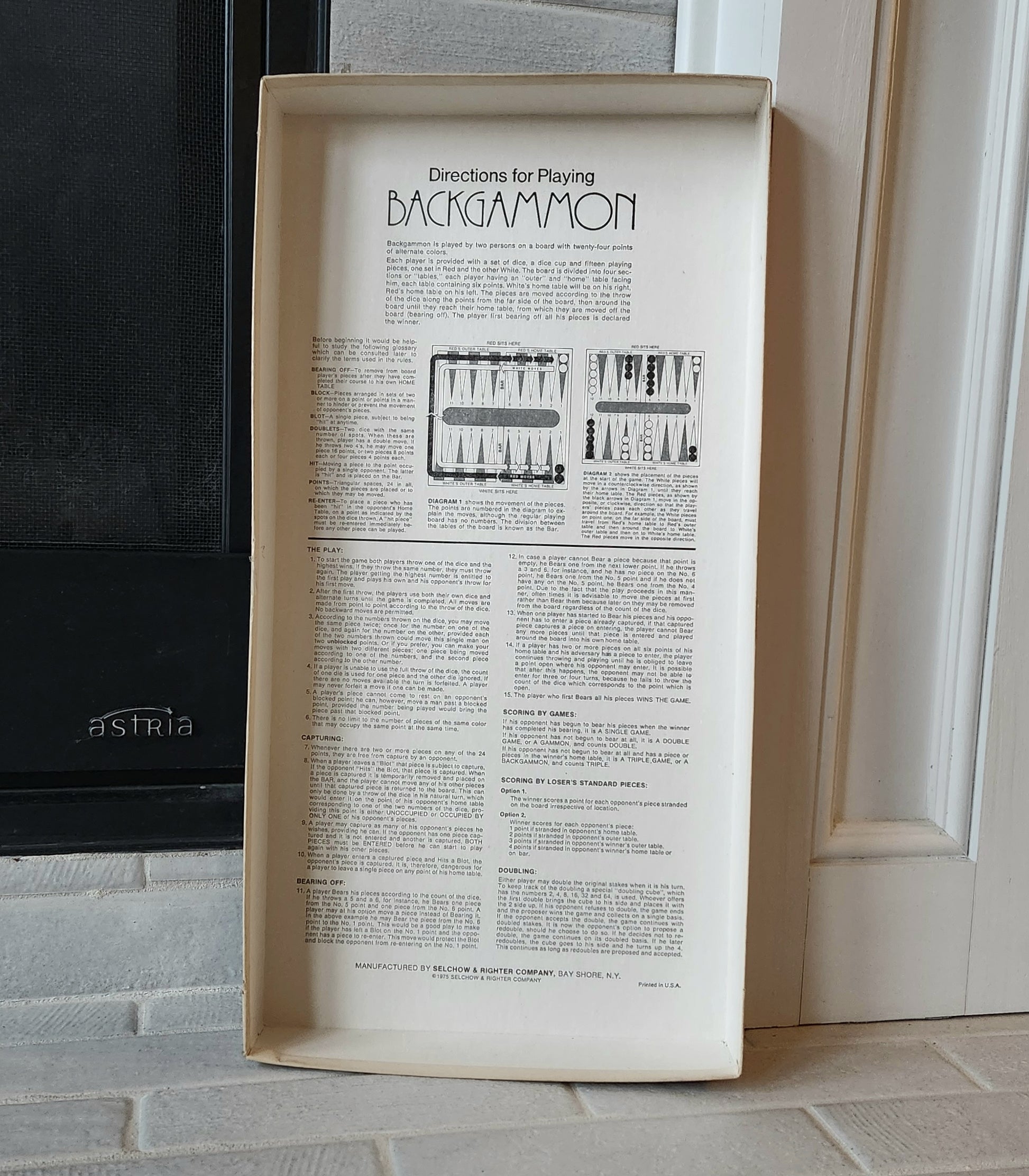This 1975 Selchow and Righter Backgammon game comes framed and ready to play. Whether you're a collector or just love classic board games, it's a solid piece that brings back that vintage gaming feel.