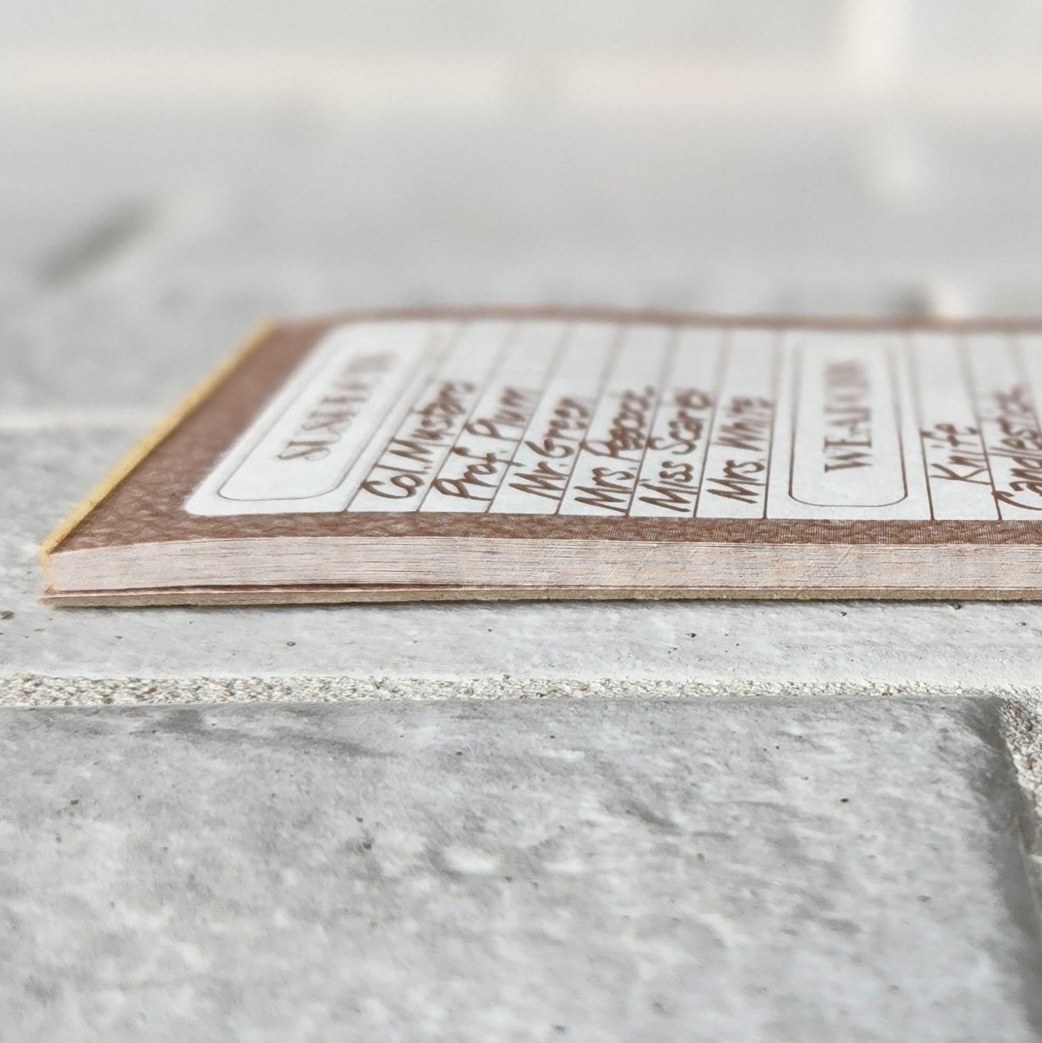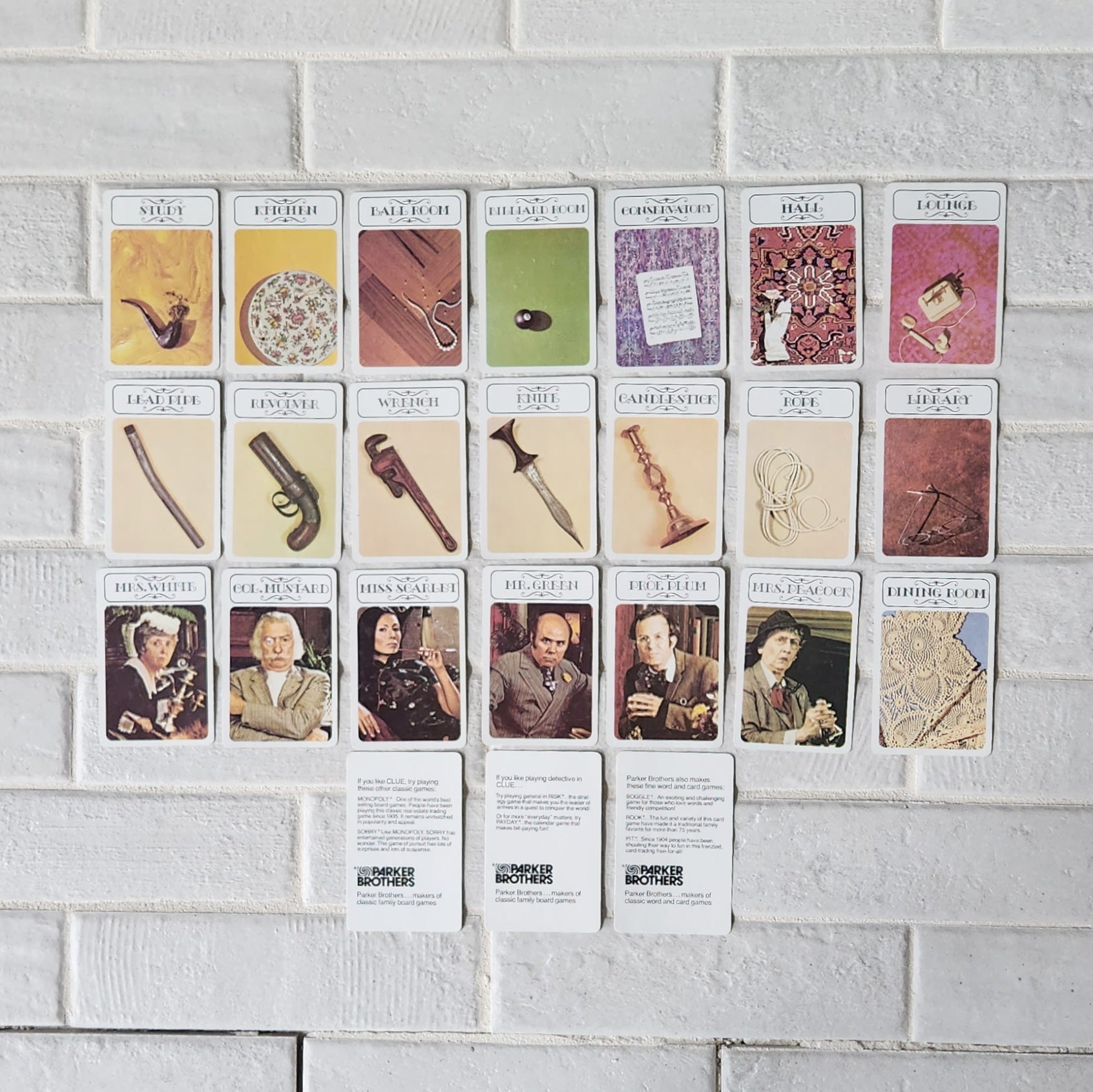 🎲 All pieces are present and in wonderful condition! The pawns are plastic and the weapons are metal with the plastic rope. The Detective Notes appear to only have a few sheets missing, if any. The cards are in fantastic condition and appear hardly used!