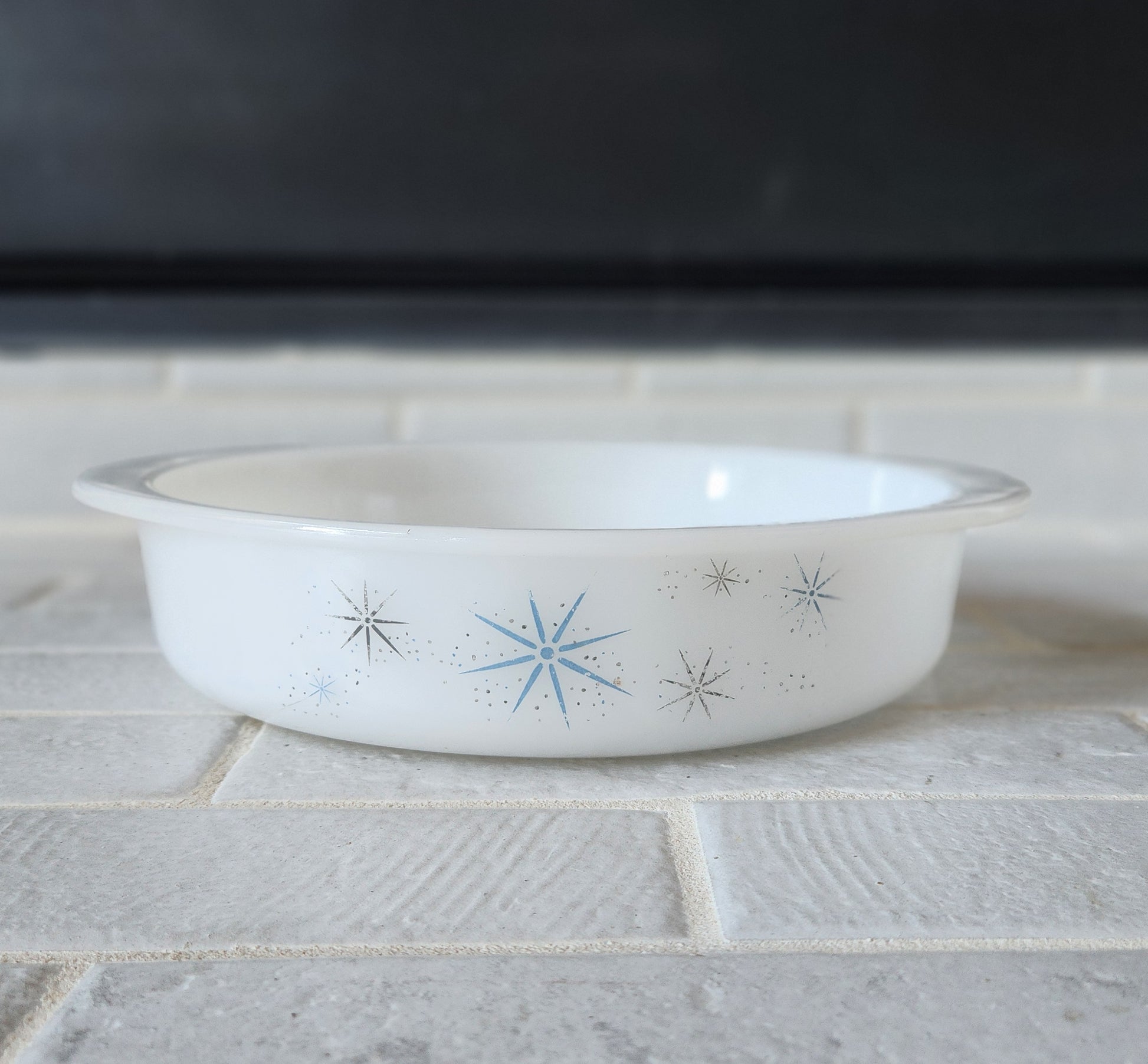 1960s Glasbake Atomic Silver and Blue Starburst Round Casserole Dish