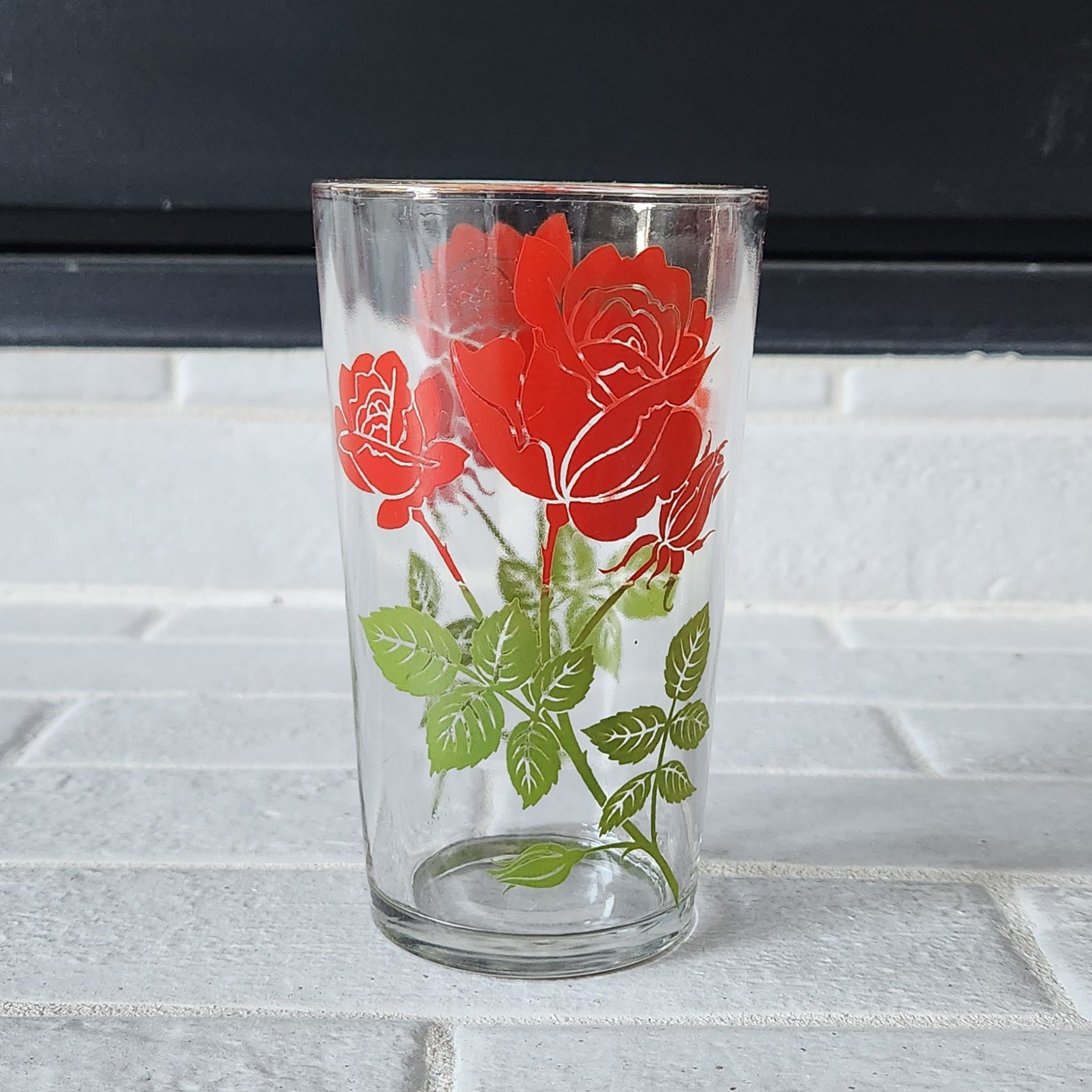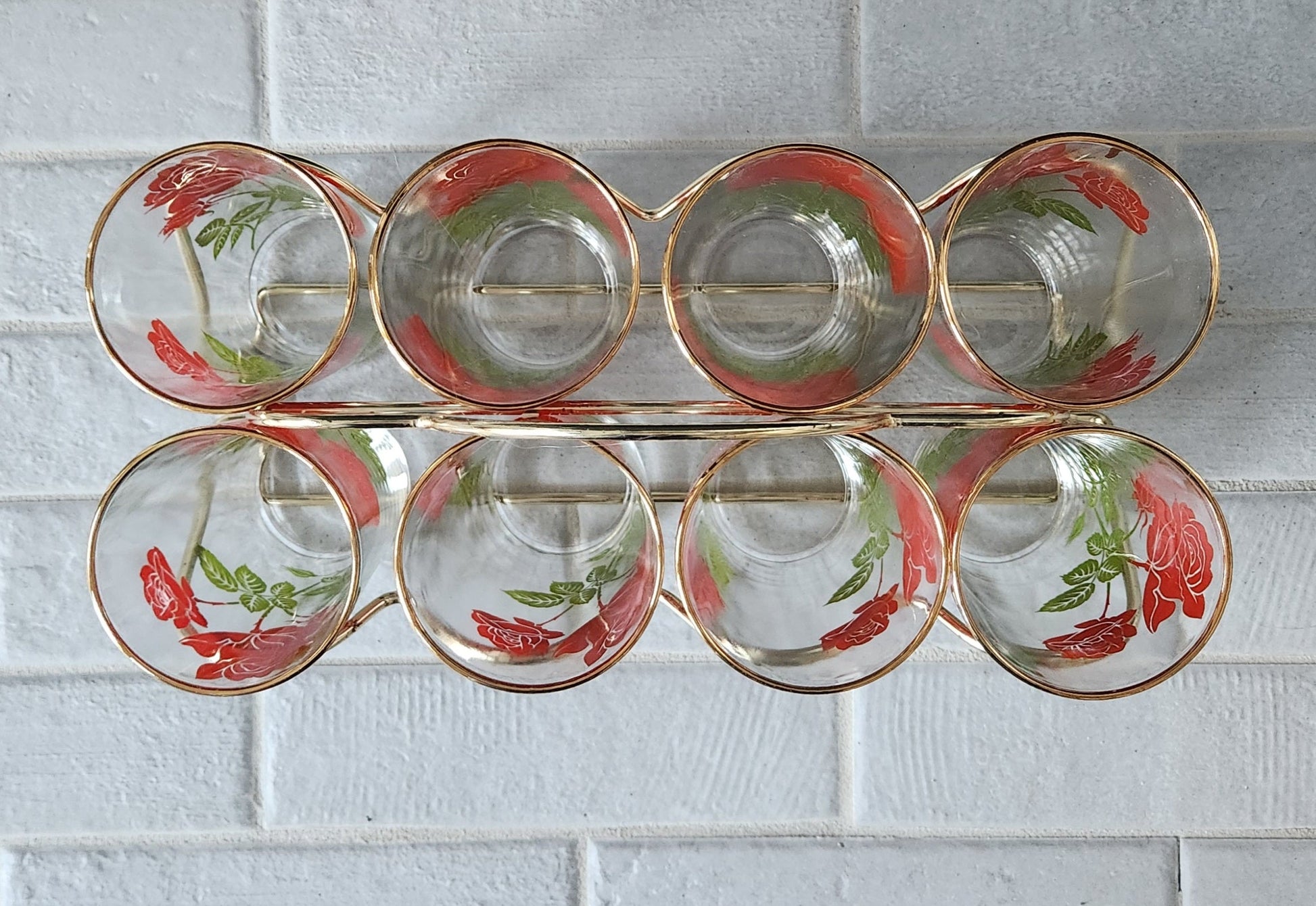 These eight vintage tumblers likely from Hazel Atlas or Anchor Hocking showcase elegant red roses and stems with a gold rim. The included gold carrier brings retro charm and practical style to your table whenever you host.