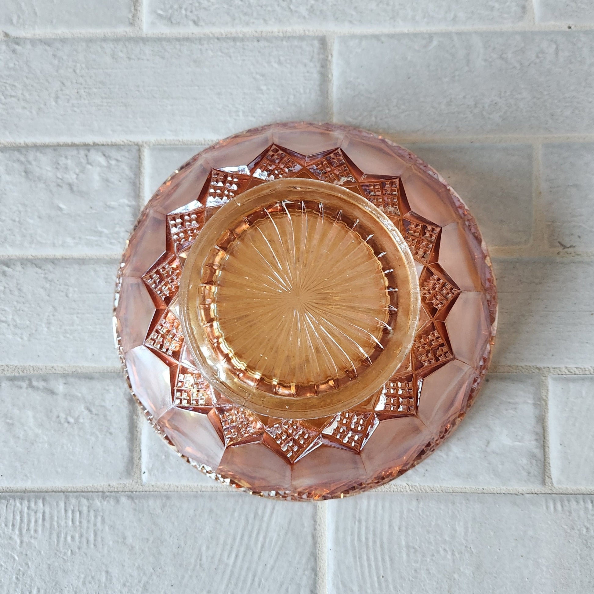 Display this radiant vintage marigold bowl as a centerpiece or use it for everyday serving its iridescent carnival glass catches the light beautifully from every angle.
